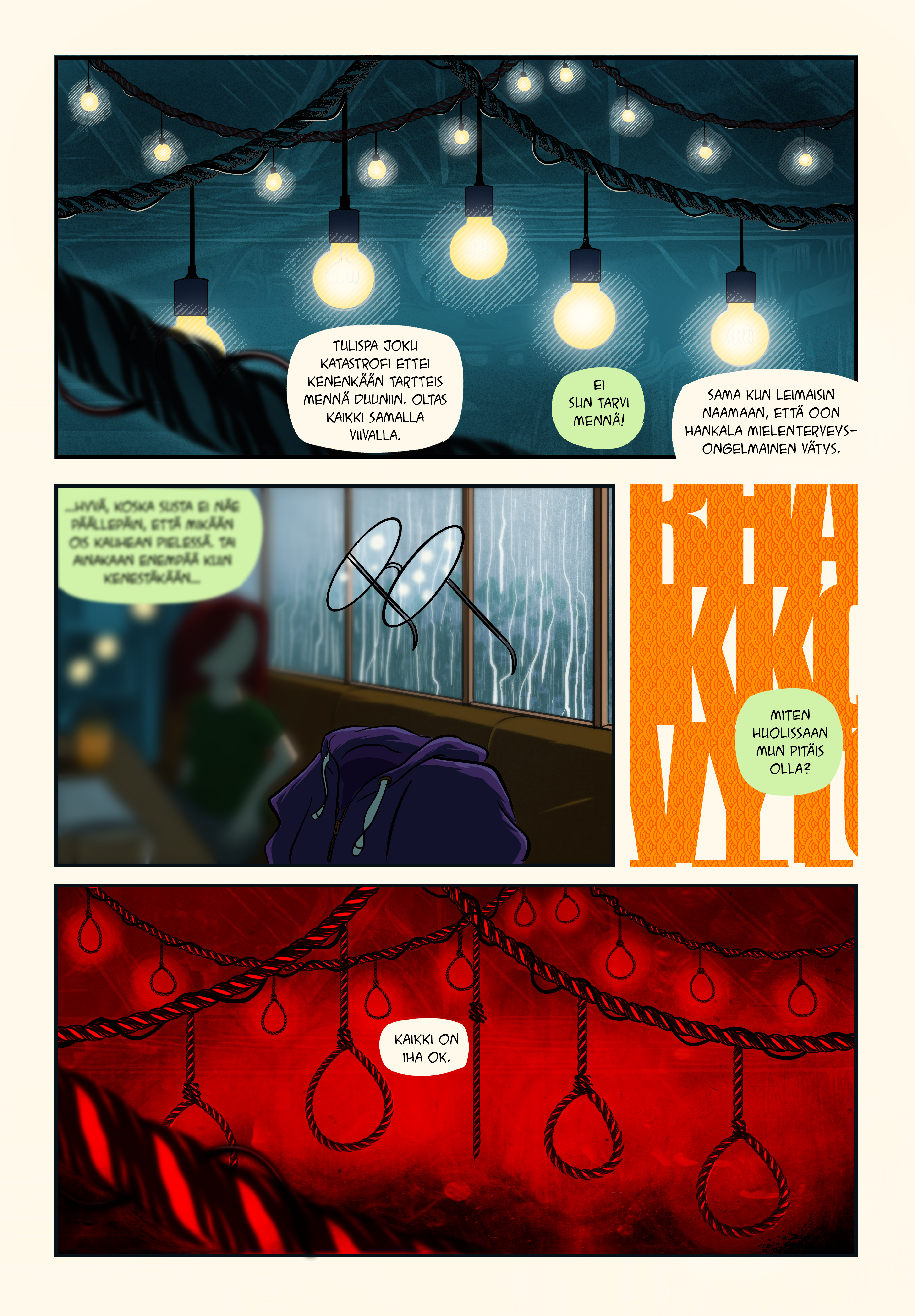 Kirjassa on Tuisku Hiltusen, Emmi Niemisen, Sami Nyyssölän, Niko-Petteri Nivan, Mari Ahokoivun, Milla Paloniemen, Henri Tervapuron, Avi Heikkisen ja Anssi Vieruahon sarjakuvatarinat.